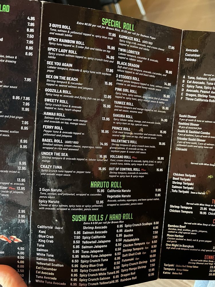 Welcome to 3 Guys Sushi, where culinary excellence meets a casual dining experience in Staten Island. This Japanese-Thai gem offers a diverse menu that promises to tantalize your taste buds. From the delicious vegetable rolls, such as the AAC Roll and Sweet Potato Tempura Roll, to the savory tempura and katsu dishes, like Shrimp Tempura and Pork Katsu, there's something for everyone.